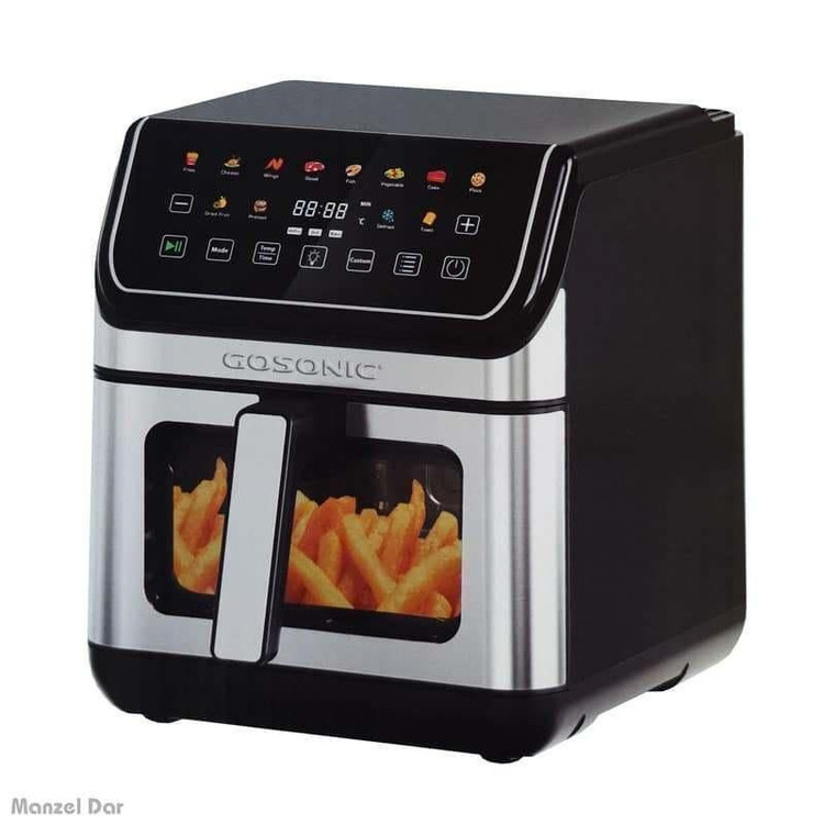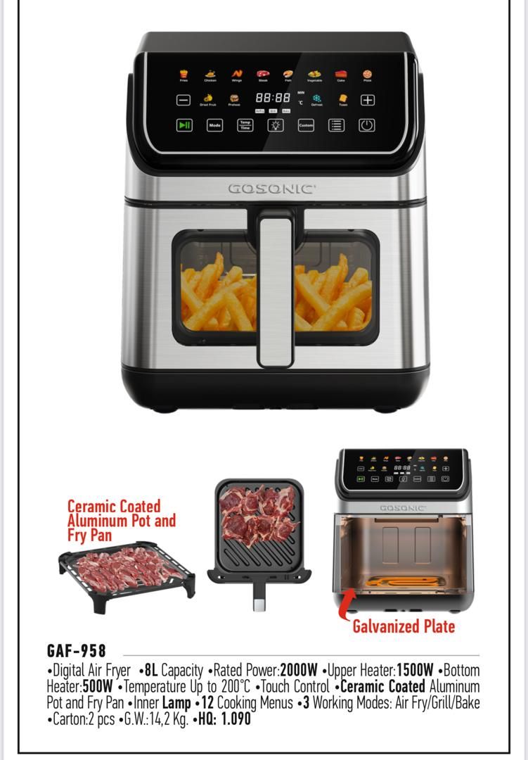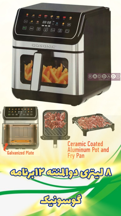 سرخکن بدون روغن گوسونیک مدل 958 با طراحی مدرن و رنگ مشکیسیلور، از بدنهای مقاوم متشکل از استیل ضدزنگ و پلاستیک فشرده ساخته شده است که ضمن برخورداری از دوام بالا، نمایی شیک و حرفهای به فضای آشپزخانه میبخشد. این دستگاه به دو المنت حرارتی مجزا مجهز شده که المنت بالایی با توان ۱۵۰۰ وات و المنت پایینی با توان ۵۰۰ وات، مجموعاً قدرتی معادل ۲۰۰۰ وات را برای پخت مؤثر و یکنواخت انواع غذاها فراهم میکنند. مخزن داخلی و سینی پخت از جنس آلومینیوم با پوشش نچسب سرامیکی تولید شدهاند و قابلیت پخت همزمان در دو طبقه مجزا را فراهم میسازند. ظرفیت ۸ لیتری دستگاه، پاسخگوی نیاز خانوادههای متوسط و پرجمعیت بوده و امکان تهیه حجم قابل توجهی از غذا را در یک نوبت فراهم میکند. این مدل به یک نمایشگر دیجیتالی رنگی مجهز است که دسترسی سریع و آسان به ۱۲ برنامه پخت متنوع را ممکن میسازد. همچنین وجود تایمر قابل تنظیم تا ۶۰ دقیقه به همراه سیستم قطعکن خودکار، ایمنی و دقت عملکرد دستگاه را افزایش داده است. سرخکن بدون روغن گوسونیک مدل 958 از جمله محصولات جدید و قدرتمند این برند بهشمار میرود که با بهرهگیری از فناوری روز، طراحی کاربردی و ساختار مقاوم، تجربهای سالم و پیشرفته از آشپزی را برای کاربران فراهم میسازد.