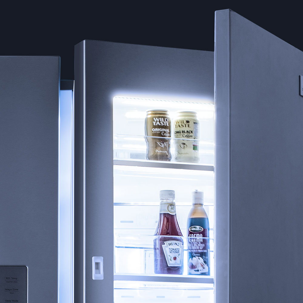 سایدبای ساید Sinsun سه در دوو با بهرهگیری از سنسورها، دمای بخشهای مختلف یخچال را اندازه میگیرد و متناسب با دما، عملکرد کمپرسور و مقدار سرمایش را در نقاط مختلف با استفاده از دریچههای متعدد تعبیه شده، تنظیم مینماید. بدین ترتیب گــردش هــوای ســرد، دمای یکسانی را در همه قسمتهای یخچــال ایجــاد کــرده و بــه حفــظ و نگهــداری مــواد غذایــی در بهتریــن دمــا کمــک میکنــد.