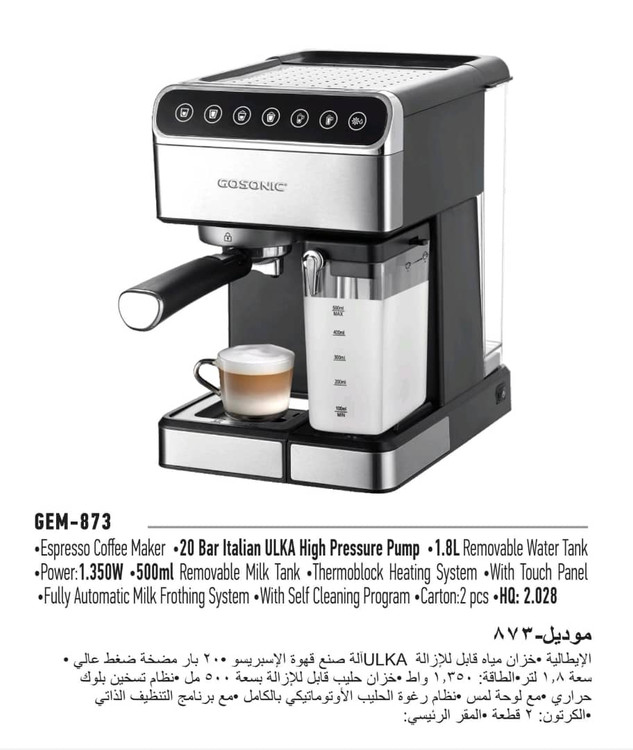 اسپرسو ساز گوسونیک مدل GEM-873 با برخورداری از ظرفیت مخزن آب 1.8 لیتر با قابلیت جداسازی طراحی شده و دارای یک مخزن شیر 500 میلی لیتر با امکان جدا سازی و تولید خودکار کف شیر می باشد. جنس بدنه دستگاه نیز ترکیبی از استیل ضد زنگ + پلاستیک مقاوم و دارای کنترل پنل لمسی می باشد.