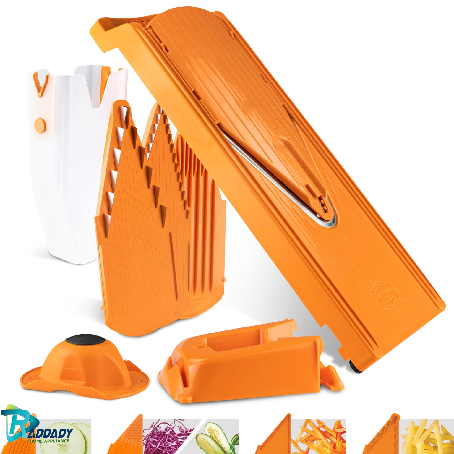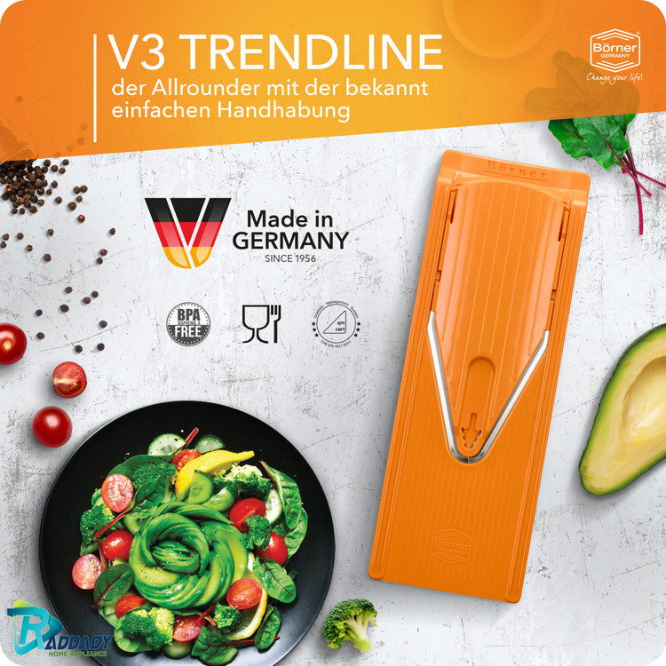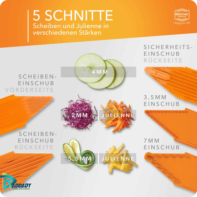 رنده آلمانی ارجینال برنر مدل V3 بهترین وسیله ای است که در آشپزخانه می توان استفاده کرد تا کارهای آشپزخانه را راحت تر، سریع تر و لذت بخش تر انجام شود.این رنده برنر با استفاده از پلاستیک با کیفیت و تیغه های ضد زنگ بسیار تیز ساخته شده است. رنده آلمانی برنر V3 به شما اجازه می دهد تا به سادگی میوه و هرگونه سبزیجات را در میزان ضخیم یا نازک ورقه ورقه یا خرد کنید . می توانید ورقه های ضخیم سیب را برای کیک پای، سبزیجات یا رشته های باریک سیب زمینی را برای سرخ کردن، هویج و کلم را برای سالاد فصل، تکه های چهارگوش گوجه فرنگی، خیار و پیاز را نیز برای سالاد مورد علاقه تان در زمانی باور نکردنی، فقط در چند ثانیه آماده کنید. نکته : تیغه های رنده آلمانی ارجینال برنر بسیار تیز و خطرناک هستند و در صورت بی توجهی می تواند صدمات جدی ایجاد کند . هنگام استفاده ، از قسمت محافظ دستگاه استفاده کنید و به کودکان اجازه استفاده از این وسیله را ندهید .