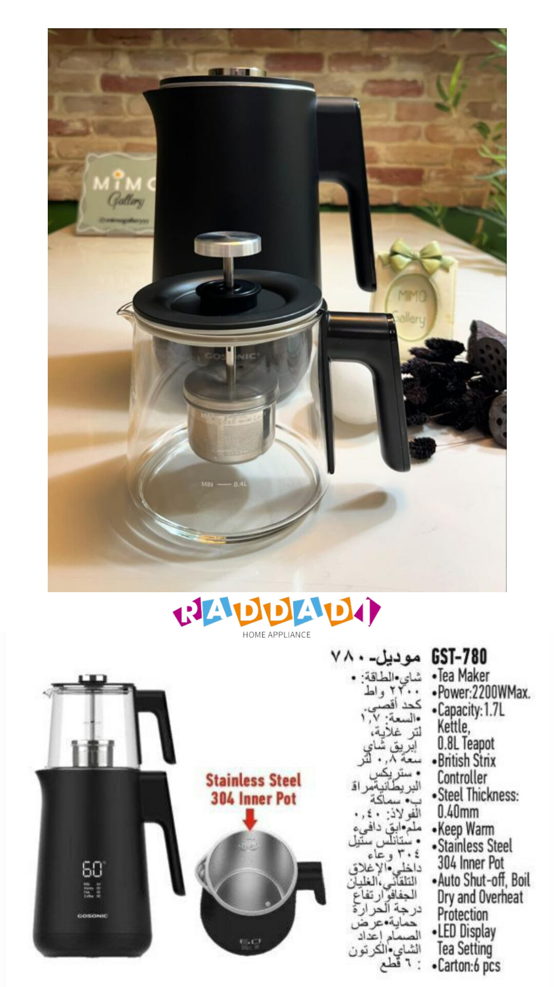 ظرفیت کتری چای ساز گوسونیک مدل GST-780 دارای گنجایش 1.7 لیتر می باشد. این گنجایش برای قوری شیشه ای به اندازه 800 میلی لیتر تعبیه شده است.