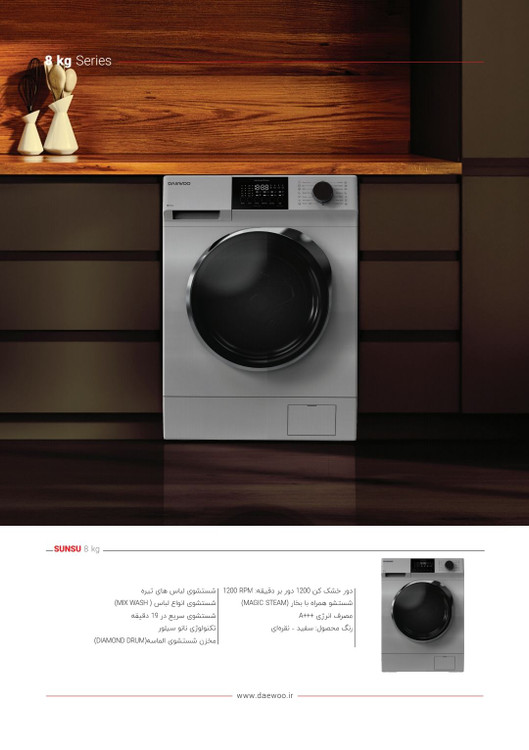 معرفی ماشین لباسشویی دوو سری یونیک 8 کیلویی مدل DWK-UN810C ماشین لباسشویی ها دارای ویژگی های مختلفی هستند که به دلیل استفاده روزمره به ویژگی هایی نظیر رده مصرف انرژی باید توجه داشته باشید تا بتوانید از مصرف بیش از حد انرژی جلوگیری نمایید. ماشین لباسشویی دوو 8 کیلویی مدل DWK-UN810C یکی از ماشین لباسشویی های جدید دوو از سری یونیک می باشد. این ماشین لباسشویی دوو سری یونیک 8 کیلویی مدل DWK-UN810C دارای رتبه مصرف انرژی A+++ بوده که به دلیل مصرف بسیار کمی که دارد جزو ماشین لباسشویی های کم مصرف بازار قرار گرفته است. این محصول دارای موتوری بسیار قدرتمند از نوع موتور یونیورسال بهبود یافته بوده که دور موتور آن 1200 دور در دقیقه می باشد. این لباسشویی دوو دارای درام الماسه طرح جدید است. درام هایی که طراحی الماسه دارند، بیش از حد با البسه سایش نداشته و منجر به خوردگی الیاف لباس ها نمی شوند زیرا اگر سطح تماس بیش از حد کم باشد، این امر از حرکت درست لباس ها درون دیگ جلوگیری می کند و باعث می شود شستشوی آنها به صورت نامناسب صورت پذیرد. سایر ویژگی های ماشین لباسشویی دوو سری یونیک 8 کیلویی مدل DWK-UN810C لباسشویی ها معمولا به دو دسته کلی درب از بالا و درب از جلو تقسیم می شوند. ماشین لباسشویی دوو سری یونیک 8 کیلویی مدل DWK-UN810C از نوع ماشین لباسشویی ها درب از جلو می باشد. این ماشین لباسشویی دوو سری یونیک مدل DWK-UN810C دارای ظرفیت 8 کیلو بوده که برای خانواده هایی با جمعیت متوسط گزینه مناسبی می باشد. این محصول مجهز به فناوری نانو سیلور است که باعث از بین بردن بوی نامطبوع و باکتری های موجود در لباس ها می شود. همچنین این محصول دارای سیستم شستشو با تاخیر بوده و مجهز به 15 برنامه شستشو می باشد.