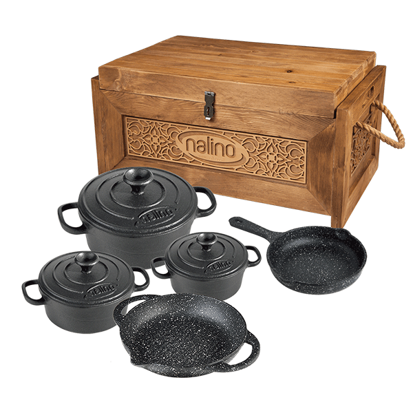 سرویس ۸ پارچه چدنی Fico محصولی جدید از خانواده نالینو که جای خالی آن به شدت محسوس بود این سرویس از جنس چدن اصل است و شامل قابلمه های سایز : 18-20-24 سانتیمتری تابه 24 سانتیمتری تابه تکدسته 20 سانتیمتری نکته قابل توجه این است که درب قابلمه 24 با تابه ست می شود. از جمله نکات جذاب این سرویس جعبه چوبی آن است که ظرافت و کاربردی بی نظیری دارد.