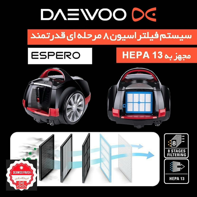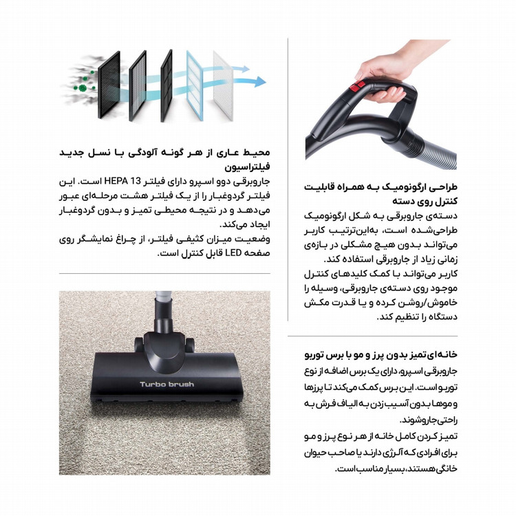 جاروبرقی تاشی(اسپرو)، دارای فیلتر HEPA 13 است. این ویژگی گرد و غبار را فیلتر کرده و در نتیجه محیط را عاری از هرگونه آلودگی میسازد. وضعیت میزان کثیفی فیلتر، از طریق نمایشگر LED روی صفحه جاروبرقی قابل مشاهده است.